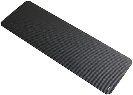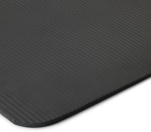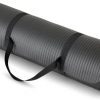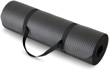 About this item 100% NBR foam Imported Extra thick, cushy floor mat in Black for yoga, gym, and everyday exercise 1/2 inch thickness offers comfortable padded support and shock absorption; textured surface provides extra traction Durable foam construction offers stretchability and springs back into shape Elastic strap for secure rolled-up mat storage and easy over-the-shoulder carrying Wipes clean easily Product Dimensions: 74 x 24 x .5 inches (LxWxH)