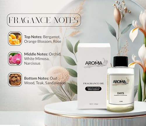 | Feature | Package Includes: Each order contains a 120ml bottle of Aroma by Deja Vu diffuser oil, providing long-lasting fragrance and numerous uses for your home or office. |