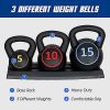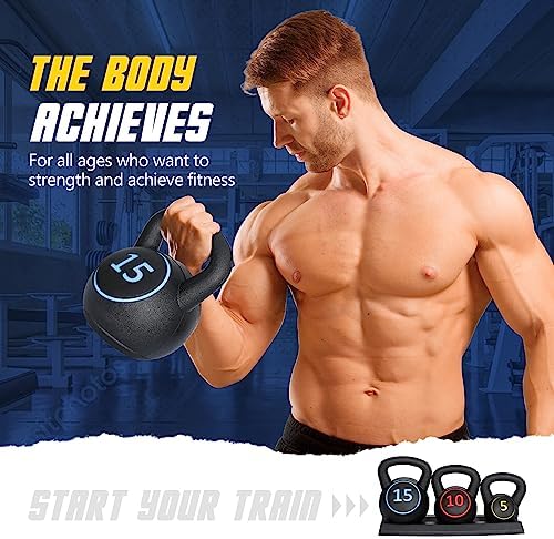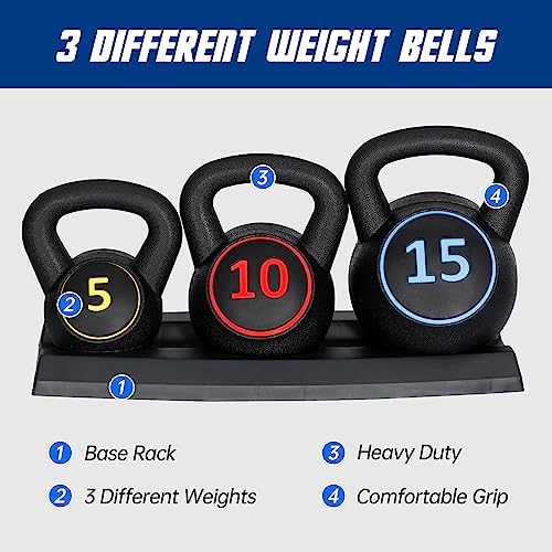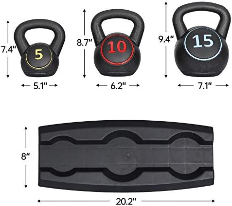 About this item 【Set of 3 Kettlebell】Set includes 3 kettlebells at 5, 10, and 15 pounds. 5-Pound Kettlebell: φ5.1″*7.4″; 10-Pound Kettlebell: φ6.2″*8.7″; 15-Pound Kettlebell: φ7.1″*9.4″. The conveinence of having 3 different weight bells makes your workouts more efficient because you’re able to switch at the your convenience at anytime 【Sturdy and Long-lasting Materials】Each kettlebell is covered with Long-lasting HDPE outer layer and filled with cement, strong sturdy and heavy duty. So you do not need to worried about them getting rusty or your hardwood floor getting scratched 【Ergonomic Wide Handle】The wide range of weight stratify versatile kettlebell fitness routine for different ages and genders, perfectly indoor use. The grip on each of these is wide and does not change in size despite the weight size. The grip is matte so even if you are sweating you feel secure in every movement 【Convenient Storage Tray】These kettlebells feature a flat bottom for stability during in use and after use, it helps make the area look nice and neat. They take up little space, great for small apartment and easy to carry, so you can do workouts here and there in your home 【Versatile & Functional Training】Great indoor exercise equipment to help develop your muscular strength, core strength, endurance, balance, stability, improve coordination and joint integrity as it forces you to use different muscles to control it like swings, deadlifts, squats, get-ups and many more. Kettlebells can also eliminate pains due to intrinsic muscle weakness and old injuries, which leads to improvement in overall functional health Compared to adjustable kettlebells, this kettlebell set offer better balance and the advantage of not requiring weight adjustment, reducing the potential safety risks associated with component detachment or loosening