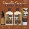 such a beautiful and gift-worthy set — it looks cozy, tropical, and luxurious all at once! This set is absolutely gorgeous and smells amazing! The vanilla coconut scent is so relaxing—sweet, warm, and tropical without being overpowering. Everything comes beautifully packaged, perfect for gifting (or treating yourself!). The bath bombs fizz nicely, the lotion leaves my skin soft, and the basket is reusable too. It honestly feels like a spa day at home. Highly recommend!