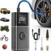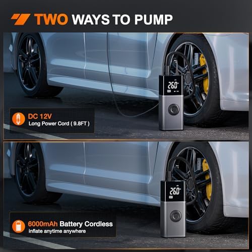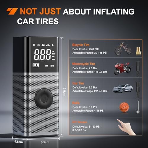 About this item Cordless Tire Inflator: The inflation pump is equipped with three rechargeable 6000mAh battery, which can quickly Tire the car without relying on the cigarette lighter power supply. This portable air inflator has a built-in high-performance chip that quickly inflates tires and provides 22 L/min of airflow. The cylinder specification of this pump is 22mm, which only takes less than 2 minutes to inflate the tires of SUV cars. Easy Operation & Auto Shutoff: Start car ignition, connect cigarette lighter plug to the 12V DC power outlet, set the desired value, and wait for the numbers to stop blinking. Turn on the switch, the air compressor will stop automatically when the preset value is reached. No more attention and keep an eye on it until it’s full. Digital Display & LED Lighting: 4 pressure measurement units of PSI, KPA, BAR, KG/CM2. The tire pressure will be displayed on the screen of the air pump so that the pressure can be better controlled when inflating tires to ensure safety. Furthermore, the air pump comes with a LED lighting feature includes backup light, warning light and flash light modes to support your inflating needs in dark environment. Wide Range of Applications: 3 nozzles and a replacement fuse were Included. Inflates any Schrader valve on cars, SUVs, ATVs, motorcycles, and bicycles. The provided accessories can inflate balloons, sports balls, air pillows, cushions and mattresses quickly. NOTE: This pump is NOT intended for use with high pressure or large volume applications like trucks, pools and Inflatable canoes. Package Includes: Portable air compress pump, 12V car cigarette lighter power cable,Type-C charging cable, Inflation tube, Bundled cloth bag, 3 nozzles, a replacement fuse and an instruction manual