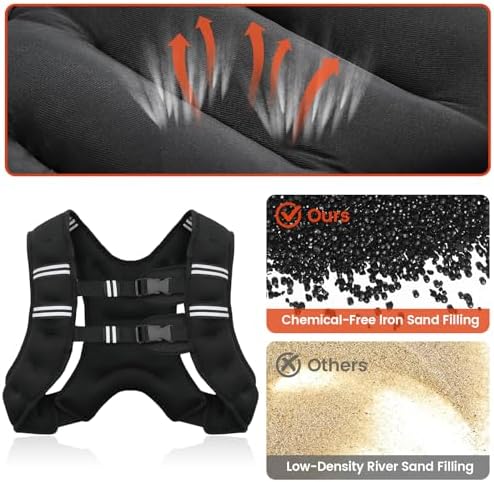 | Feature | EVEN WEIGHT DISTRIBUTION – The vest is evenly filled with iron sand, ensuring an even weight distribution. This helps to minimise the risk of injury during exercise. |