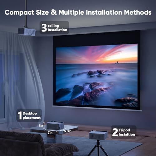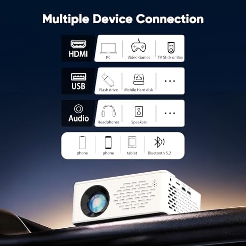 About this item 【Portable Projector Screen Included】The V08 mini projector includes a projection screen that is tailored to meet our customer’s needs. As opposed to other projectors, our included projector screen allows you to set up your own home theater anywhere to watch movies, TV shows, photos, slide shows, and play video games. This portable, foldable, anti-wrinkle and easy to wash projection screen is larger than others, which ensures wider viewing angles and enhanced picture detail. 【Upgraded 1080P HD Video Projector】To better meet your needs, we have upgraded this home projector with our latest LED light source. This small projector features 1080P Full HD supported. 【Two-way Bluetooth Function】With built-in upgraded speaker, you can enjoy a cinematic audio-visual experience without connecting external speakers. Also, this portable projector built-in Bluetooth 5.1 technology to make the audio synchronization faster and more stable. With this Bluetooth projector, you can connect your ideal Bluetooth speakers or headphones wirelessly at any time to get more wonderful sound. Please Note: Bluetooth connection is only for audio transmission with audio devices (Bluetooth speakers or Bluetooth headphones), which cannot be used on smartphone screen mirroring. 【Portable Mobile Home Cinema】The V08 movie projector provides a minimal display area of 32” to a maximum 220” image with projection distances between 1.5-6m. Aspect Ratio: 4:3/16:9, Contrast Ratio: 5000:1, Lamp lifetime: 60,000 hours. It enables excellent playback of movies, TV shows, video games and can be set up conveniently. Our newly improved 2023 uniform illumination method provides the optimal visual experience, ensuring no dark areas are present along the edges of the displayed image. 【Compatibility Instruction】 This mini projector also can be compatible with phones and tablets, if you need to connect the phone or tablet, please prepare a HDMI adapter cable. For ios device, you need to use the official Lightning to HDMI adapter to connect your phone with the projector. (HDMI adapter is not included.) For Android device, if your phone supports MHL, then you can use the micro usb/type-c to HDMI cable to connect your phone with the projector. (HDMI cable is not included.) If your phone does not support MHL, you should prepare a Chrome-cast to connect your phone with the projector. 【Warm Tips】Due to HDCP (High-bandwidth Digital Content Protection) agreement, screen mirroring doesn’t work (no image or sound) when you try to mirror the content from some apps (Amazon Prime Video, Hulu, etc.), Please play these videos by inserting your TV Stick/Roku/Chrome-cast into our projector. You can also connect to a laptop/computer to play via HDMI Connection (HDMI Cable Included).